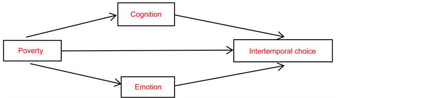 In summary, although a small number of studies suggest that there is no relationship between income and time discounting rate. Most studies suggest that income has a negative relationship with discounting rate, that is to say, poverty will produce higher discounting rate, and the poor tend to choose smaller and sooner rewards in intertemporal choices. This paper supports the idea that poverty has effect on intertemporal choice through reviewing relevant literatures. Some researches focus on poor environmental conditions (such as restricted in the credit market) to explain the poor series of bad behavior, which in turn lead to further deepening of poverty (Banerjee & Duflo, 2008) . While some researches focus on the characteristics of the poor themselves, such as rarely received good education, less parental attention and vulnerable to negative shocks (Haushofer, Schunk, & Fehr, 2013) , this paper focuses primarily on the poor’s psychological process to explore the impact of poverty on intertemporal choice. Why is this happening? Numerous studies show that may exist some psychological variables to regulate the relationship between poverty and intertemporal choice. Next, we discuss the psychological mechanisms between them.