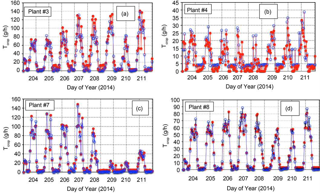 As examples, hourly values of Tcrop measured with EXO-SkinTM stem flow gauge sensors and lysimeters, all as a function of DOY, across the 8-d measurement period are given in Figure 3. For this purpose we selected plants 3, 4, 7 and 8 for hourly values shown in Figure 3. To obtain a range of Tcrop water was applied and withheld at different rates during the test period and as expected Tcrop varied by the amount of water in each container. To illustrate the different patterns of hourly Tcrop we selected four cotton plants shown in Figure 3.