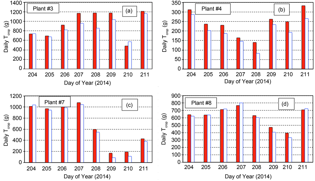 In plant #3, water was added at nighttime, from DOY 204 to 208, withheld on DOY 209 and again watered on DOY 210 (Figure 3(a)). These applications of water resulted in an increase of the hourly maximum values of Tcrop. For example, on DOY 204 and 205 the maximum Tcrop was ~80 g/h, on DOY 206 the maximum Tcrop increased to 96 g/h, on DOY 207 - 209, Tcrop maximum was ~130 g/h, declining to 80 g/h as a result of no water being applied on the previous night and increasing to 140 g/h on DOY 211 when it was re-watered (Figure 3(a)). Cotton plant #4 was watered daily, from DOY 204 to 211; however, this was the smallest plant in our experiments and the maximum
