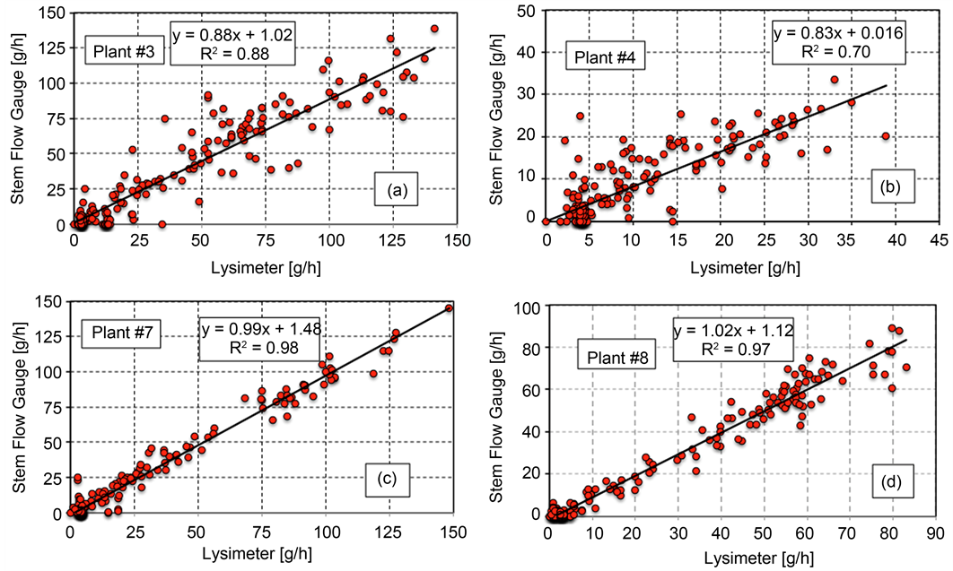 A comparison of hourly values of Tcrop measured with the EXO-SkinTM stem flow gauge sensors as a function of hourly values of Tcrop measured with the lysimeter are given in Figure 5. This comparison is a linear regression analysis for the four sensors shown in Figure 3 and Figure 4.