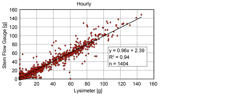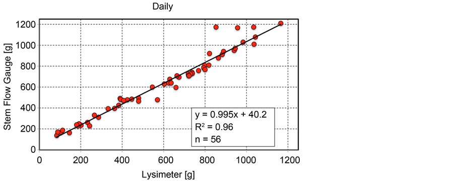 Pooling all the hourly Tcrop measurements obtained across the 8-d period resulted in 1404 paired measurements of EXO-SkinTM stem flow gauge and lysimeter measurements and the linear regression of these measurements is given in Figure 6. Similarly, pooling the integrated daily values of Tcrop resulted in 56-paired measurements and the linear regression of these measurements is given in Figure 7.