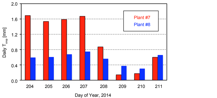 The measured values of LA for each cotton plant on DOY 212 were 1.2 m2 for plant #1, 1.4 m2 for plant #3, 1.6 m2 for plant #4, 1.2 m2 for plant #5, 1.4 m2 for plant #6, 0.6 m2 for plant #7, and 1.1 m2 for plant #8. These values of LA are typical for potted plants grown in 11-liter containers. Values of LA were used to convert hourly values of Tcrop obtained with Equation (10) in kg/s to daily values in mm/d. As examples, the calculated daily values of Tcrop in mm/d for plant #7 and plant #8 are shown in Figure 8. In these calculations the measured LA on DOY 212 was linearly extrapolated to DOY 204 assuming a 5% change in LA over the 8-d period (Figure 8).