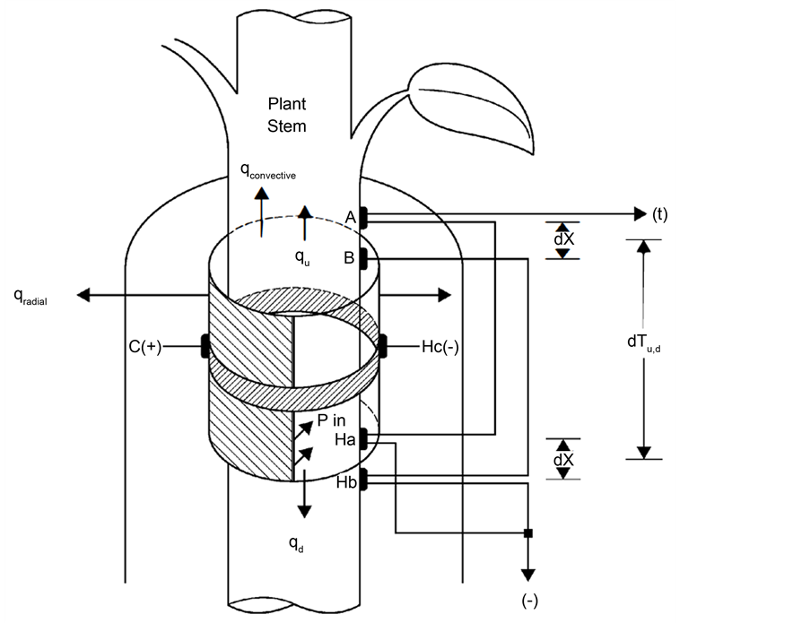 The original SHB method works by applying a known amount of heat to a small segment of the stem from a thin flexible heater that surrounds the stem and is itself encircled by foam insulation and measuring a temperature difference above and below the heater (Figure 1). In steady state, heat input from the heater is balanced by the heat fluxes out of the stem, i.e., inputs = outputs as originally given by [6] . Following is a description on the SHB to calculate Tcrop and for additional details the reader is referred to [6] - [24] .