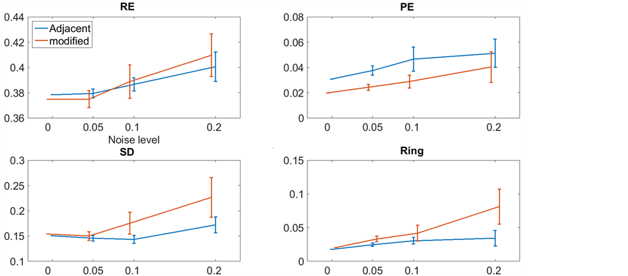 Performances of different methods are evaluated by simulation. The simulation model and data were constructed as described in Section 2.4. Four noises levels NL = 0, 0.05, 0.1, 0.2 were used to simulate the measurement noise. One step Gauss-Newton solver (Section 2.3) was employed to reconstruct images. The regularization parameter α used in Equation (5) was determined heuristically to get the best performance. This parameter was set regarding the noise levels. In Figure 4, the reconstructed images with the measurement data with a noise at level 0.05 was demonstrated. Furthermore, the reconstruction error parameters were evaluated in Monte Carlo simulations with 50 independent runs at each noise level. These results are shown in Figure 5.