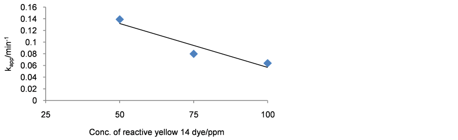 According to Figure 2, the rate constant of decolourization of reactive yellow 14 dye was inversely proportional with increasing the initial dye concentrations at ranged (50 - 100) ppm, that due to increase the dye concentration but the catalyst amount is kept constant, hence the active sites is fewer. Moreover, this behavior isinterpreted to decline the reached optical density of light in the solution [12] [17] and according to the Equations (4) - (7) for Langmuir-Hinshelwood (L-H) kinetics model possible, the increased of the dye concentration compared with the amount of •OH that source it mostly is water, then O2 and OH of catalyst, that leads to depress of the rate of decolourization.