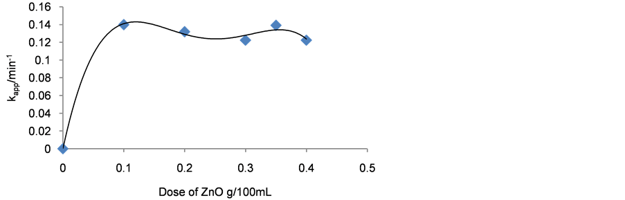 The effect of ZnO dosage is depicted in Figure 3. The results show that the measured rate constant of reaction were found to be increased with increased the catalyst dosage from 100 to 350 mg/100mL, this behavior reflects the increment of the numbers of the active sites of catalyst, which in turn increases the rate of radical formation [17] [18] .