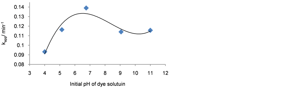 The initial pH is considered one of the most benefit parameters that affects not only on the surface charge of catalyst, but also the characteristics of textile dye, and generation of hydroxyl radicals, that enhancements the photode colourization of the organic pollutants such as a textile dye in presence of photocatalyst [17] .