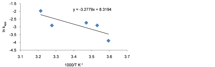 Figure 5. Pseudo-first order rate constant at varying temperature. Conductions: dye conc. 50 ppm, semiconductor dosage 350 mg/100mL, pH = 6.75, temperature 278.15 - 311.15 K, UV light intensity 2.295 × 10−8 ensien∙s−1.