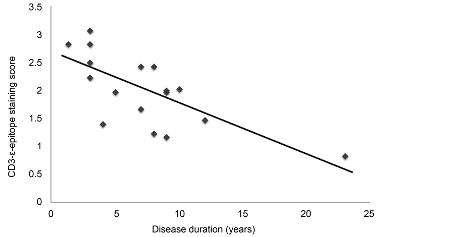Figure 2. Correlation between CD3-ε-epitope staining score of Purkinje cells and disease duration of MSA-C patients. CD3-ε-epitope staining score (Y) is correlated with disease duration (X), with the regression line having the relation Y = 2.656 − 0.089X, and the Pearson correlation coefficient R = −0.705 (p = 0.002).
