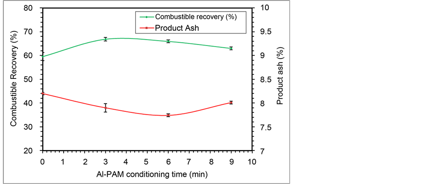 Figure 7. Effects of Al-PAM conditioning time on the combustible recovery (%) of coal and product ash (%).