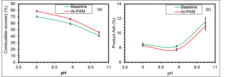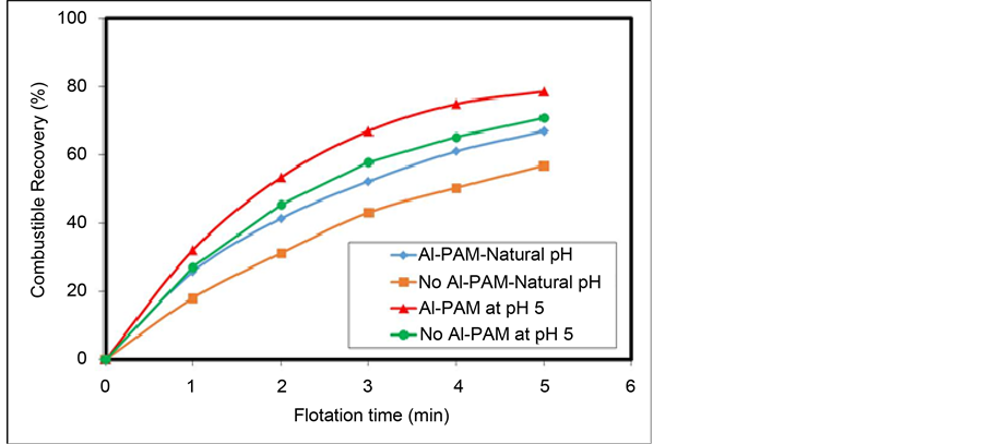 closer to its isoelectric points, i.e., at pH 3 - 5 [20] [21] . As is further shown in the Figure 8(a), the combustible recovery of coal decreased at an alkaline pH of 10.2. At this relatively higher pH, the surface charge on coal particles will be more negative and this will increase the possible adsorption or precipitation of positively charged metal ions from solution and decreased flotation. The influence of pH on clean coal combustible recovery in the presence of Al-PAM alone was similar to the trend observed for the baseline experiments. However, the addition of Al-PAM increased the combustible recovery of coal from 70.48% (baseline experiments) to 78% at pH 5. A weakly acidic pulp pH of 5 likely made the coal surface slightly less electronegative, which in turn would decrease the competitive adsorption of polymer on coal particles and increase the selectivity of polymer adsorption on ash particles. Thus, a higher floatability and combustible recovery is achieved. As shown in Figure 8(b), in the absence of Al-PAM, product ashes of 8.5%, 8.2% and 11.56% were obtained at pH 5, 7.8 and 10.2, respectively. With Al-PAM, the product ash content greatly improved to 8.29%, 7.74% and 10.9%.