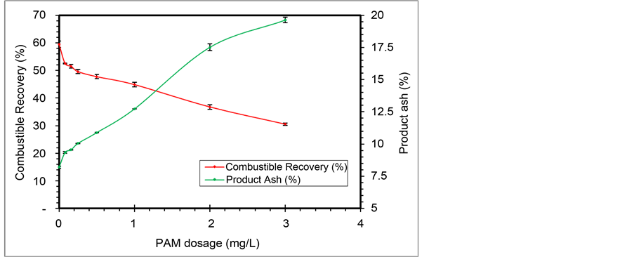 Figure 11. Effects of organic polyacrylamide (PAM) dosage on the combustible recovery (%) of coal and product ash (%).