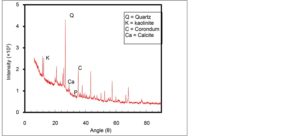 by proximate analysis. The major crystalline phases observed were FeS2 (pyrite), quartz, kaolinite Al2(Si2O5)(OH)4, corundum Al2O3 and small amounts of calcite Ca(CO3).