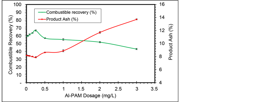 Figure 4. Influence of Al-PAM dosage on the combustible recovery (%) of coal and product ash (%).