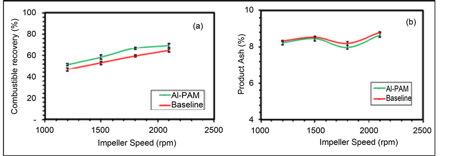Figure 6. Effect of impeller speed on (a) combustible recovery and (b) product ash in the presence and absence of Al-PAM.