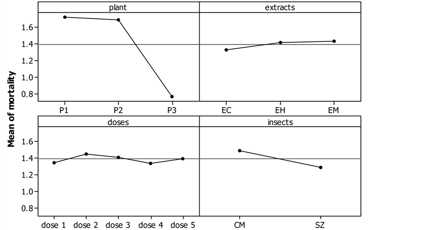 Analysis of the variance of the combined insecticidal effects (Table 3) watch which the parameter plant is highly significant (P ˂ 0.001). In the same way, the interactions plant-insects are highly significant (P ˂ 0.001). The factor insect and the interactions plant-extracts, extract-insects and plant-extract-insects are significant (P ˂ 0.05). That implies that mortality depends on the plant, the insects and the extracts. Table 1 and Table 2, Figures 1-4 have the results of the tests combined against S. zeamais and C. maculatus.