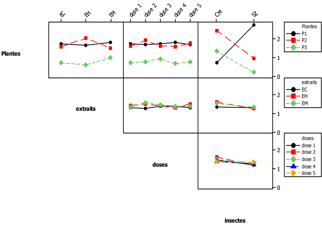 Figure 1 and Figure 2 indicate the curve of mortality according to the plants, the extracts, the amounts and the insects. The plant Tapinanthus bangwensis (P1) is effective on Sitophilus zeamais for the extracts with chloroform and methanol. The plants Crataeva religiosa (P2) and Ficus thonningii (P3) are effective on Callosobruchus maculatus and Sitophilus zeamais for the extracts with cyclohexane, administers chloroform to and methanol with P2 and for the extract methanolic with P3.