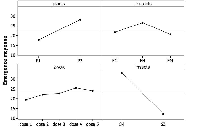For the data of the biological tests with the extracts of the plant, the measured variables are the number of died insects, the number of surviving insects and the number of emerged insects. Calculated mortality was obtained by applying the formula of Aboth (1925): Mc = (Mo − MT)/(100 − MT) × 100; (where Mo = mortality in the treated batches, MT = mortality in the witness and Mc = calculated mortality). The variables many died insects, number of the surviving insects and number of the emerged insects are subjected to a variance analysis, model fixed with three factors (extracted, amounts and time). Variable mortality rate underwent a transformation arcsin (X = mortality rate, N = size of the population; n = 1999) in order to standardize the population and to stabilize the variance. The general method linear model in Minitab 17 was used for the statistical analysis of the collected data. The variables many surviving insects and many insects emerged as for them underwent a transformation square root in order to standardize the population and to stabilize the varian. The curves and the tables are used to have the result of the analysis.