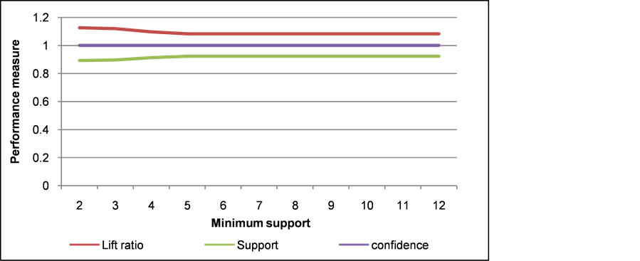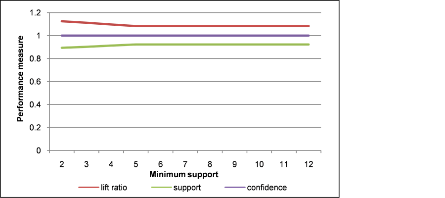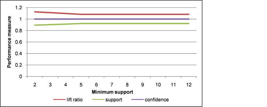 The five graphs at Figure 5 up to Figure 9 show that the performance measurement including lift ratio and support of the constructed pattern tends to be