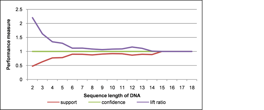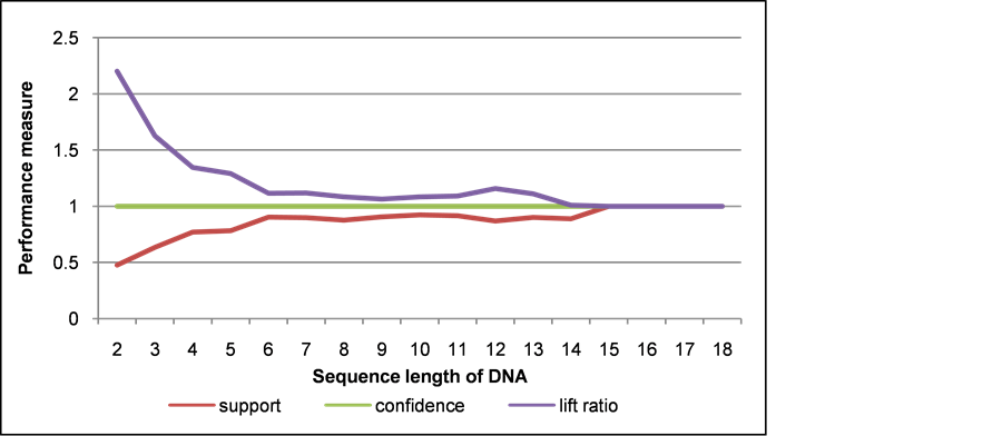 on DNA sequence database of patient’s cancer disease. By giving the threshold such as various minimum support and sequence length, different sequence patterns are obtained. In order to know reliability of the system, it is evaluated using three performance measures, including support, confidence, and lift ratio. The experimental results show that almost all the support value is closed to 1. It means that the probability of co-occurrence for sequence-items in the pattern is high. Also, the confidence value is always 1. This shows that the pattern has believable value at 100%. Furthermore, the lift ratio is almost always more than 1. This means that the patterns which consist of items are dependent each other.