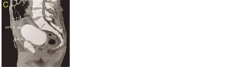 The initial suspicion departs from urinary complaints related to the urothelial tract injury associated with history of urinary disorders or manipulation of the urinary tract and pelvis. Diagnostic tools should be employed, starting with the plain radiograph of the abdomen, ultrasound of the urinary tract and cystoscopy [7] . In our case, CT was the method of choice, due to patient’s presentation and the presence of a palpable mass in the hypogastrium.