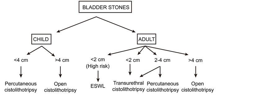 Torricelli and colleagues from São Paulo performed a metanalysis regarding bladder stones treatment; they proposed some guidance and as seen in the chart bellow (Figure 3), the size of the stone influences the way it will be approached [10] .