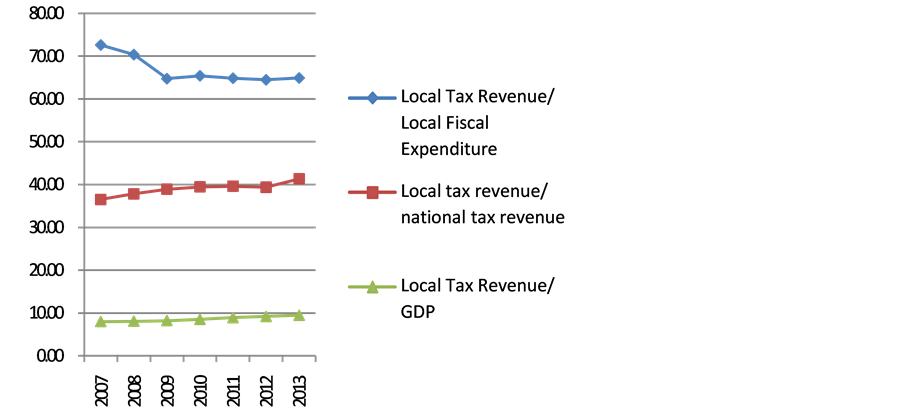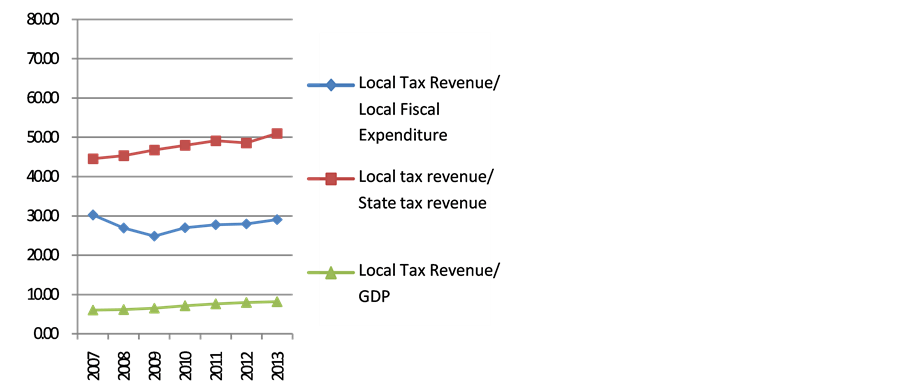 and its scale is closely related to the overall tax revenue of the country. As can be seen from Table 2, in recent years, China’s macro tax burden continues to increase. Until 2013, small-caliber macro tax burden has reached 19.43%, higher than most scholars have inferred reasonable range. The proportion of local tax revenue to GDP has been increasing year by year, and the proportion of it to tax revenue in the whole country has been increasing, which to some extent reflects that the tax revenue is tilted slowly to the local government. From the relationship between taxation and fiscal expenditure we can see that the national tax revenue provides nearly 80 percent of the state’s fiscal expenditure, local taxes account for less than 50 percent of the local fiscal expenditure, while the local government’s financial expenditure burden of the national fiscal expenditure 85%, which shows that there is a serious non-reciprocal between local power and financial rights, local tax revenue is far from meeting local spending needs.