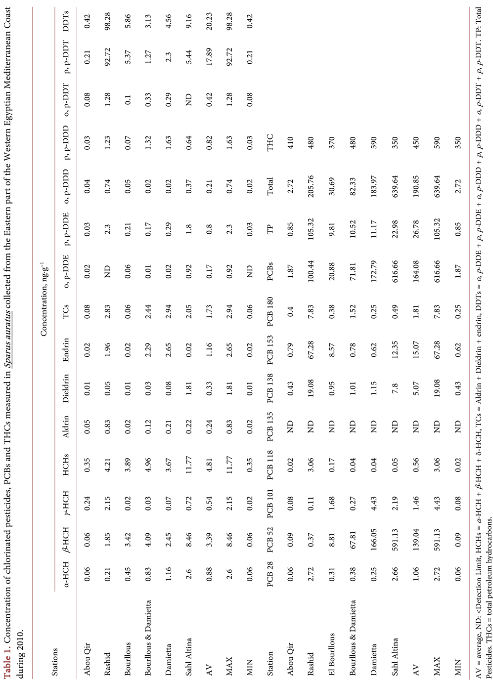 Table 1. Concentration of chlorinated pesticides,PCBs and THCs measured in Sparus auratus collected from the Eastern part of the Western Egyptian Mediterranean Coast during 2010.