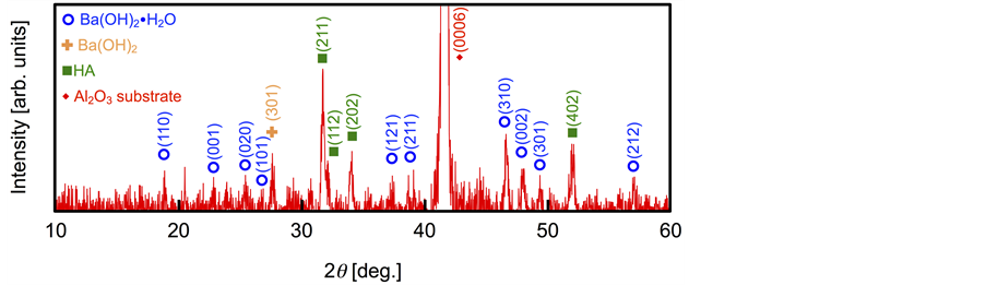 First, we examined the deposition of Ba-compound layer on the Al2O3 (0001) substrate. The XRD pattern of 1.5 μm thick Ba-compound layer is shown in Figure 2. It is concluded that the deposited Ba-compound was single phase Ba(OH)2×H2O. However, we consider that the deposited Ba-compound was not Ba(OH)2×H2O just after the deposition because its melting point is 78˚C at the standard pressure. Ba(OH)2, the parent material of Ba(OH)2×H2O, has also low melting point of 408˚C compared to the substrate temperature during the deposition. Here, we ablated Ba metal target in a pure oxygen atmosphere as described in Table 1. Judging from the experimental condition in this study, we speculated that the initial deposited layer was BaO, whose melting point is 1923˚C at the standard pressure, i.e., much higher than the substrate temperature. While the Ba-compound remained BaO in the growth chamber, it will change into Ba(OH)2 compounds via chemical reaction with the water vapor in the air owing to its ease of chemical reaction to water, once it was taken out from the growth chamber.