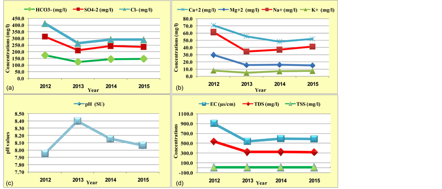 Figure 2. The annual mean of: (a) Major anions concentrations; (b) Major cations concentrations; (c) pH values (SU); and (d) EC values TDS and TSS concentrations in (MDR).