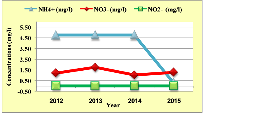 Nitrogen compounds of greatest interest in water quality are those that are biologically available as nutrients to plants or exhibit toxicity to humans or aquatic life [33] . In soil, fertilizers containing inorganic nitrogen and wastes containing organic nitrogen are first decomposed to give ammonia, which is then oxidized to nitrite and nitrate [27] . The nitrate concentration ranges from 1.03 to 1.74 mg/l (Figure 3). The presence of nitrate may be due to the application of fertilizers, decaying plant and animal residues and contamination by the sewage disposal and livestock facilities. Nitrate is present in the study area at relatively very low concentrations. The nitrite concentration ranges from 0.01 to 0.03 mg/l (Figure 3) and the average of nitrate and nitrite concentration are within the permissible limit as specified by [26] and [27] . The term “ammonia” covers both the unionized form (NH3) and the ammonium cation (NH4+) unless stated otherwise [27] . The ammonium cation is less mobile in soil and water than ammonia and is involved in the biological processes of nitrogen fixation, mineralization, and nitrification [34] . The ammonium concentration ranges from 0.30 to 4.75 mg/l (Figure 3) and the mean of all samples exceed the permissible limit as specified by [26] and [27] . Higher natural contents of ammonia are found in strata rich in humic substances. The presence of ammonia at higher than geogenic levels is an important indicator of fecal pollution [35] .
