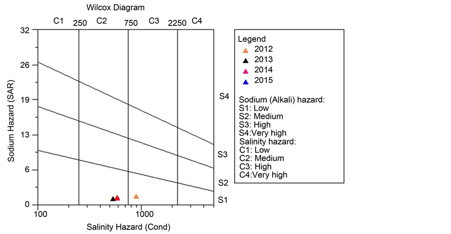 The calculated value of SAR in the study area ranges from 1.5 to 1.83 (Table 5) through the study period. Based on SAR values, all the surface water samples were categorized as normal water for the purpose of classification of irrigation water with respect to [42] as shown in Table 7. The plot of data on the Wilcox salinity diagram (Figure 4), in which the EC is taken as salinity hazard and SAR as alkalinity hazard, shows that all of the surface water samples during the year 2013-2015 fall in the category C2S1 but through the year 2012 the samples fall in the category in C3S1, indicating medium (2013-2015) to high (2012) salinity and low sodium water which can be used if a moderate amount of leaching occurs over the period (2013-2015) but cannot be used on soil with restricted drainage during 2012. Even with adequate drainage, special management for salinity control may be required, and plants with good salt tolerance should be selected. These classifications were based on the use of irrigation waters, according to the U. S. Salinity Laboratory Staff (1954) water quality classification [43] .