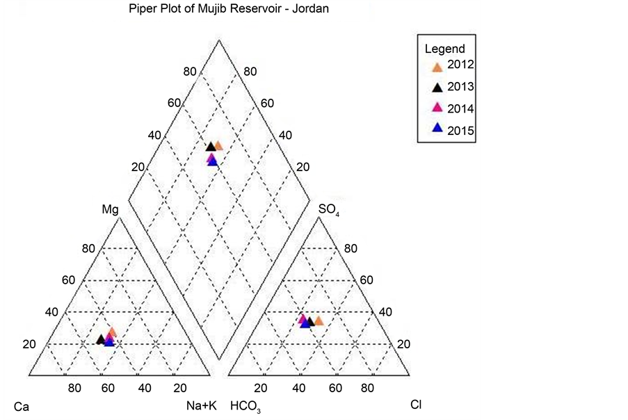 Charts were used for the purposes of clarification and interpretation of the results, the results of the analysis of the twelve samples of each year in the reservoir were annually averaged. This means that one annually representative averages respectively, were used instead of 48 samples over the study period from 2012 to 2015. An assessment of the water quality of the surface water for Mujib reservoir was primarily based on the four main cations (calcium, magnesium, sodium and potassium) and the main anions (bicarbonate, sulfate, and chloride). Piper [20] proposed a trilinear diagram that permits the classification of waters, dividing the waters into seven types. The AquaChem software, version 4.0 from the Waterloo Hydrogeologic was used for plotting this diagram. This study is an attempt to predict the effects of the surface lithology of the catchment area on the