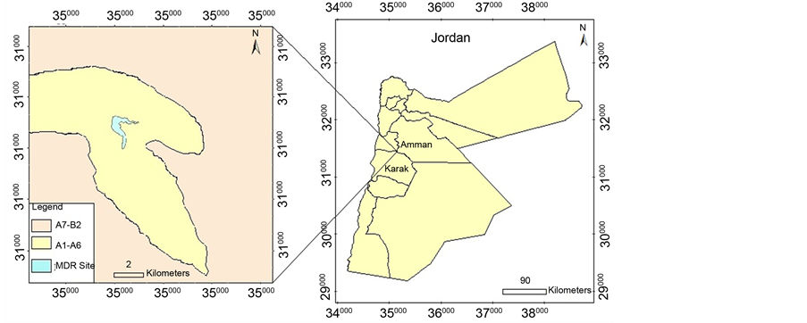The topography of the Wadi Mujib is characterized by smooth rolling hills, steep slope, and the presence of talus sediments produced by landslides. Elevation in the area is varying from 335 m below sea level in Wadi Mujib, to 1279 m above sea level southwest of the study area (near Al-Mazar) [18] . Highway 35, part of the historic King’s Highway, crosses the crest. The water it impounds is combined with desalinated water piped from brackish wells along the Dead Sea to the west in a reservoir holding 35 million m3 (1 billion US gallons) which primarily supplies Amman, 100 kilometers (62 mi) to the north helping to ease a very stressed national water supply [2] .