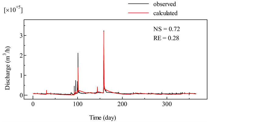 Hakata Bay. Figure 1 shows the structure and parameters of the tank model at the Zuibaiji River. The tank model for the Zuibaiji River has three tanks, and the first tank has three outlets. This is because the model was focused on flood analysis. The parameters were decided by trial and error process. The calculation period was from 1 April 2002 to 31 March 2003. The calculated discharge of the Zuibaiji River was compared with the discharge observed during the same period shown in Figure 2. The Nash?Sutcliffe coefficient (NS = 0.72) and relative error (RE = 0.28) indicate that the calculated discharge accurately reproduced the observed data. Since the characteristics of the other main rivers are similar to those of the Zuibaiji River, all tank models can be assumed similarly to have good reproducibility. Discharges of small rivers were calculated by multiplying each catchment area by the average runoff (mm/hour) of the six main rivers.