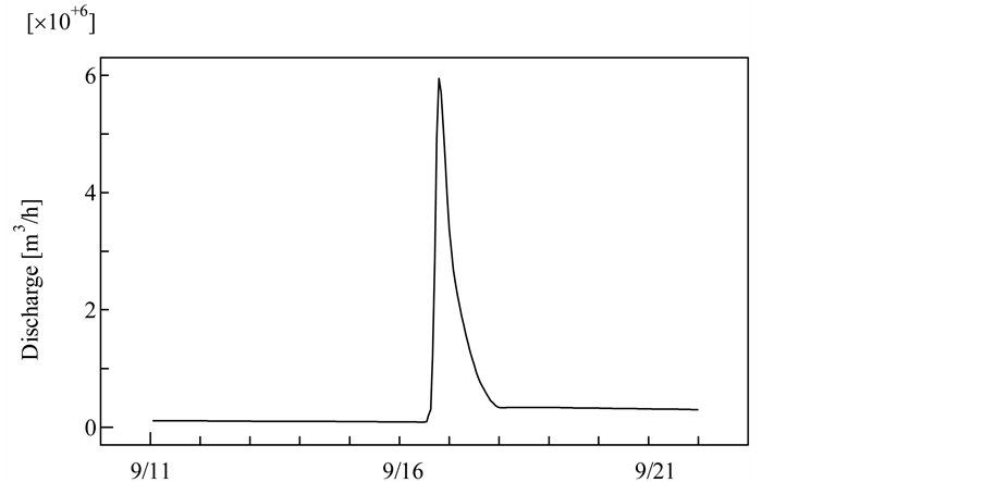 In this research, the impact of large discharges from rivers due to torrential rain was analyzed by using a hydrodynamic model with the edge-type nesting technique targeting Hakata Bay. The calculation period was from 11 September 2002 to 21 September 2002 because there was torrential rain on September 16 in Fukuoka City (163.5 mm/d). Major discharges from approximately 40 inflow points, varying in scale owing to the torrential rain, were taken into consideration in the hydrodynamic model. The total amount of all river discharges during the calculation period of the hydrodynamic model is shown in Figure 3. Because of heavy rain on September 16th, the total amount increased drastically to about 60 times more than the discharge before the torrential rain.