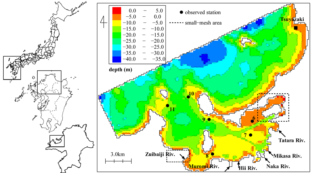 Firstly, in this research, a tank model is used as a hydrologic model. This is often done to calculate discharges of watersheds (e.g., [4] [5] ). The tank model is applied to calculate river discharges due to torrential rain. Secondly, the convective-dispersive model of salinity is applied to estimate the impact of major fresh- water inflow due to torrential rain. Hakata Bay has narrow and complicated sea areas such as Imazu Bay and the artificial island called “Island City” in the western and eastern parts of the bay, respectively. A numerical solution with high resolution is essential and effective for estimating and predicting such environments. Nevertheless, a substantial amount of time is needed for calculation, dividing the whole area into small meshes. Nesting techniques are suitable for dealing with this difficulty: wide areas can be covered quickly while finer calculations are conducted in specific narrow areas (e.g., [6] [7] ).