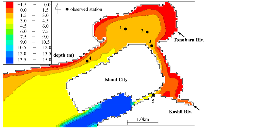 Figure 4 shows the bathymetry of the low-resolution area. The target bay was Hakata Bay, which is located in Fukuoka City, Kyushu Island, Japan. An artificial island called “Island City” lies in the eastern part of the bay and Imazu Bay lies in the western part of the bay. These two regions are shown as high-resolu- tion areas in Figure 5 and Figure 6. Because the area around “Island City” is