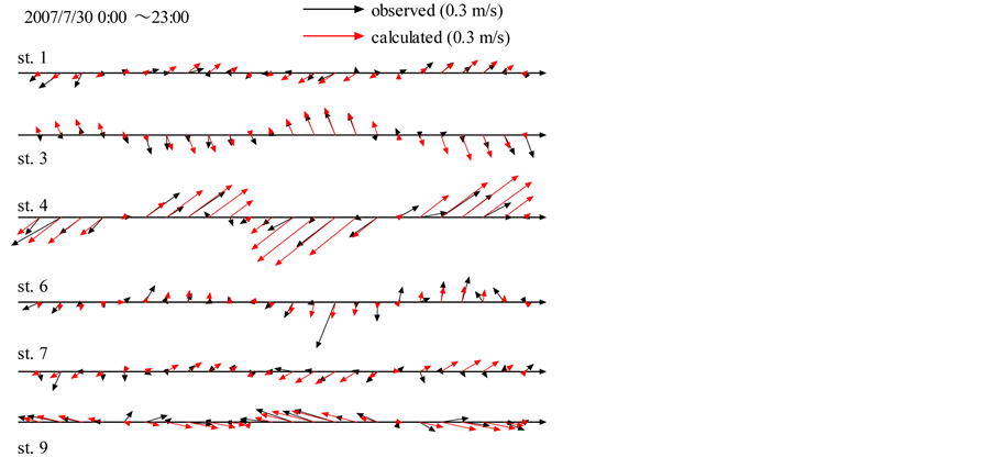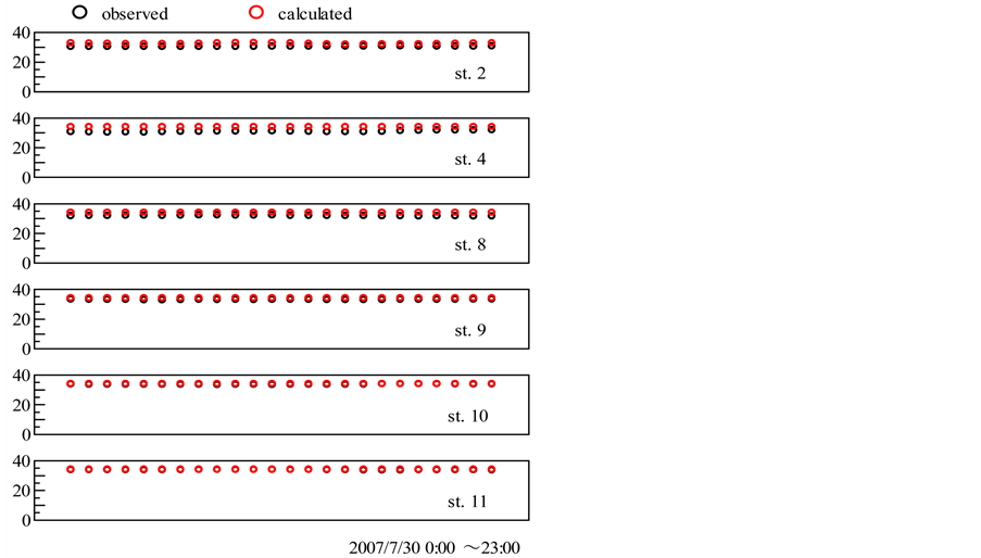 Figure 7 shows the comparison of observed and calculated tidal current vectors at observation stations shown in Figure 4 and Figure 5 from 0:00 to 23:00 on July 30, 2007 in 1-h intervals. The tidal current vectors showed good agreement with observed vectors. Complicated flow in narrow areas due to the constructions of “Island City” was well reproduced. Figure 8 shows the comparison of observed and calculated salinity at observation stations shown in Figure 4 and