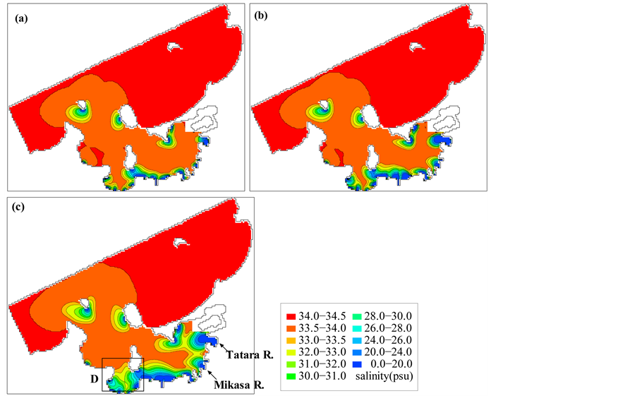 Figure 9 shows the calculation results for contour lines of salinity in the low- resolution area. It shows the distribution of salinity (a) just before the torrential rain, (b) after the torrential rain, and (c) two days after the torrential rain, respectively. Comparing Figure 9(a) and Figure 9(b), fresh water spread out near the mouths of rivers. However, large changes can be found when Figure 9(c) is examined. Low-salinity water covered the whole of the inner part of Hakata Bay, and water of lower salinity than outer sea water (<34.0 psu) spread out to the bay’s mouth. Fresh water from Tatara River and Mikasa River, in particular, spread out broadly, and low-salinity water covered all of area D, although it did not cover it in panels (a) and (b). Figure 10 shows the calculation results in the high-resolution area of the eastern part of Hakata Bay, and panels (a), (b), and (c) are shown at the same times as in Figure 9. Fresh water spread out and high-salinity water (>34.0 psu) was reduced when comparing Figure 10(a) and Figure 10(b), but large differences can be seen in Figure 10(c). The whole area around “Island City” was covered with low-salinity water due to river discharges within the area and fresh water from the low-resolution area. It was found that fresh water takes more than two days to spread out, and stays in the inner part of the bay for a long time. According to [16] , an anoxic water mass was induced in