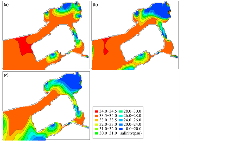 Figure 9. Distribution of salinity (a) at 8:00 on September 16, 2002, (b) at 4:00 on September 17, 2002, and (c) at 22:00 on September 19, 2002 in the low-resolution area.