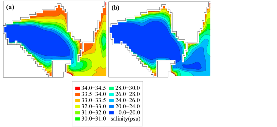 Figure 11. Distribution of salinity (a) at 8:00 on September 16, 2002 and (b) at 6:00 on September 18, 2002 in the high-resolution area, Imazu Bay.
