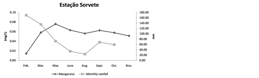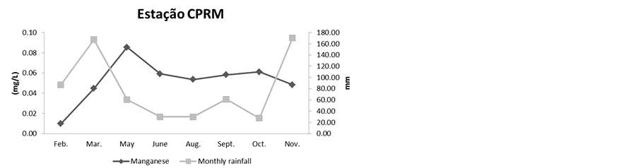 It was also observed that the ions of this parameter were greater in concentration in the period of less precipitation; including even the month of October, despite this month being part of the traditional “rainy season”. This observation can be seen more clearly in Ponte Gilberto and the Stations CPRM and Sorvete (Figure 7).
