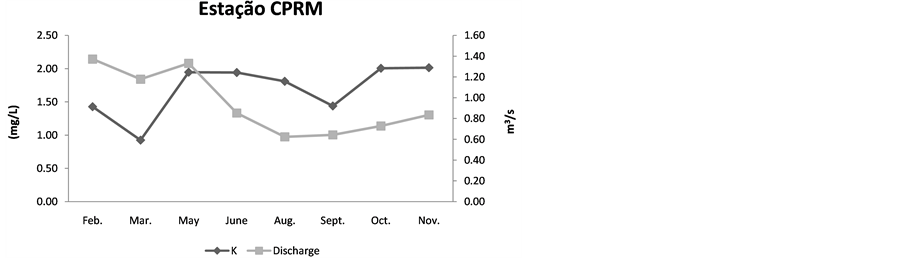 With regards to the behavior exhibited in the flow of the channels, from a space-time perspective, a higher concentration of K was found during the dry season (and less water volume in the river channel) in the three observed stations (Figure 8).