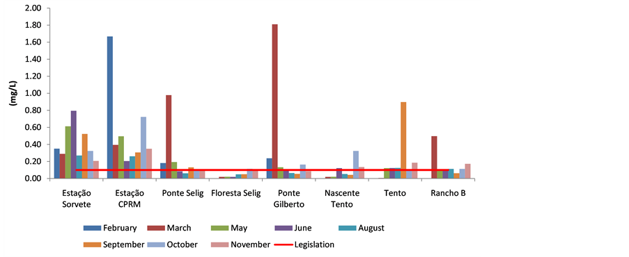 Throughout the sample period were found high concentrations of Al in the basin. Data showed a progressive increase from upstream to downstream, with the exception of the sample point that is embedded within a forest area (Floresta Selig), according to the specifications of CONAMA. It is important to emphasize that the quality of spring water for three months was in non-compliance with the legislation and showing high values. A pattern of exceedance can also be observed in two other points (Estação Sorvete e CPRM) further downstream in the drainage basin, as shown in Figure 6.