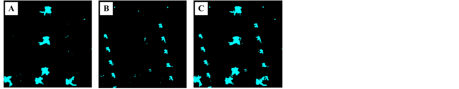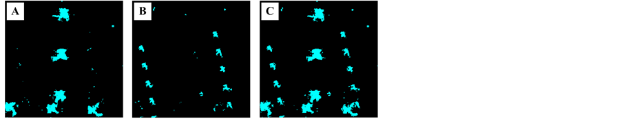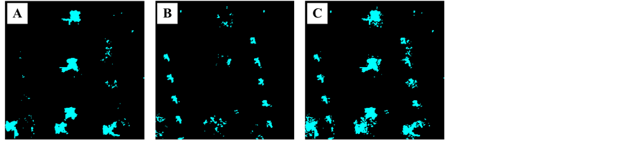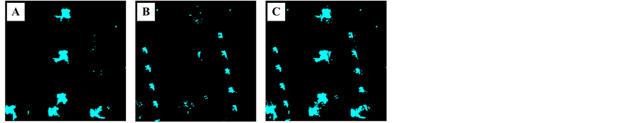 Figure 4. Results of at first carry out fusion and then detect change information (t2 relative to t1, (A) weakened area, (B) enhanced area, (C) fusion of (A) and (B)).