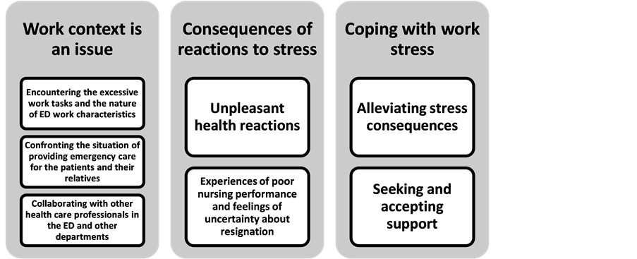 The sources of stress found in the current study were related to the three dimensions in the JDCS model. “Work context is an issue” reflected the nurses’ experiences that involved the psychological demand and limited job control at the ED. The ED work characteristics, such as excessive work tasks, heavy workload, and extended work hours caused stress among the ED nurses, as has previously been described [1] [2] [6] and could be seen as high psychological demands [4] . Work requirements beyond nursing, e.g. performing physicians’ tasks and being a mentor for new junior nurses, also caused stress. Limited decision-making authority (job control) and being in an uncontrollable situation, interfered with their capacity to complete their tasks [3] [17] . The sub-category “seeking and accepting support” reflected the nurses’ experiences of inadequate support at work. When there is high demand, low control, and low support at work, a high- strain situation in the workplace can develop and lead to negative health outcomes [4] . This was observed in the category “consequences of reactions to stress” in the current study.