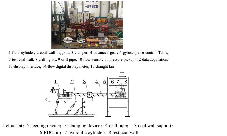 According to the theory of rock cutting and breaking, the establishment of the gas drainage drilling test bench (Figure 6) is built. The test bench mainly has two parts, the power system and the testing system. The test rig drilling experiments is not only used in drilling coal rock with PDC bit ,but also in a variety of types of bits drilling test.