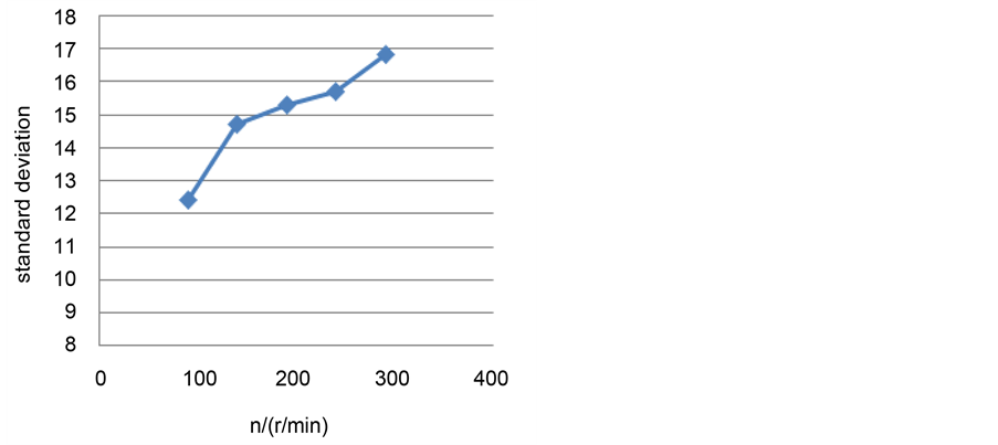 To research the influence of rotation speeds on load fluctuation, drilling coal rock experiment is carried out under different rotation speeds. Working condition parameters in the process of drilling coal rock are as follows: protodyakonov coefficient of coal is f:f = 1.03, confining pressure is 7 MPa, feed speed is 0.7 m/min, rake angle of PDC bit is 15˚, rotation speed is 90 r/min, 140 r/min, 190 r/min, 240 r/min and 290 r/min. Feeding resistance and drilling torque is got under different rotation speed is shown in Table 1. Figure 7 and Figure 8 show influence of rotation speed on load fluctuation characteristics.
