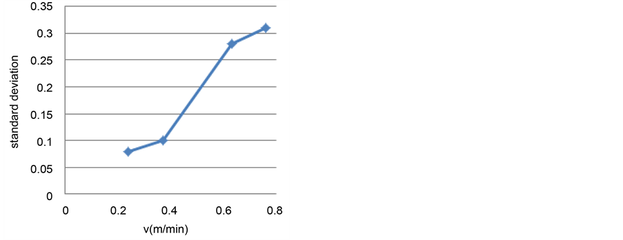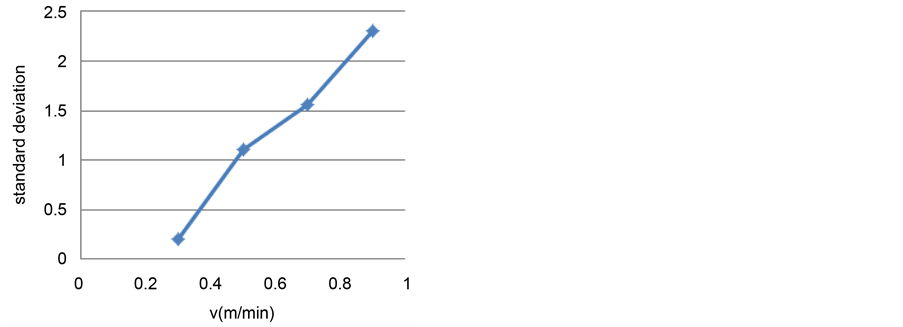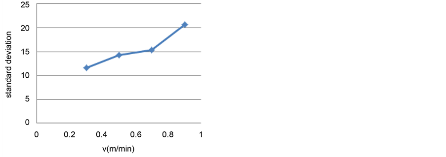 In order to research the influence of feed speeds on load fluctuation, drilling coal rock experiment is carried out under different rotation speeds. Working condition parameters in the process of drilling coal rock are as follows; Rotation speed is 290 r/min, Plattcoefficientf = 1.03 experimental coal wall, confining pressure is 7 MPa, bit rake angle of PDC bits is 10˚, feeding speed is 0.3 m/min, 0.5 m/min and 0.7 m/min. Feed resistance and drilling torque is got under different rotation speed is shown in Table 2. Figure 9 and Figure 10 show influence of feeding speed on load fluctuation characteristics.